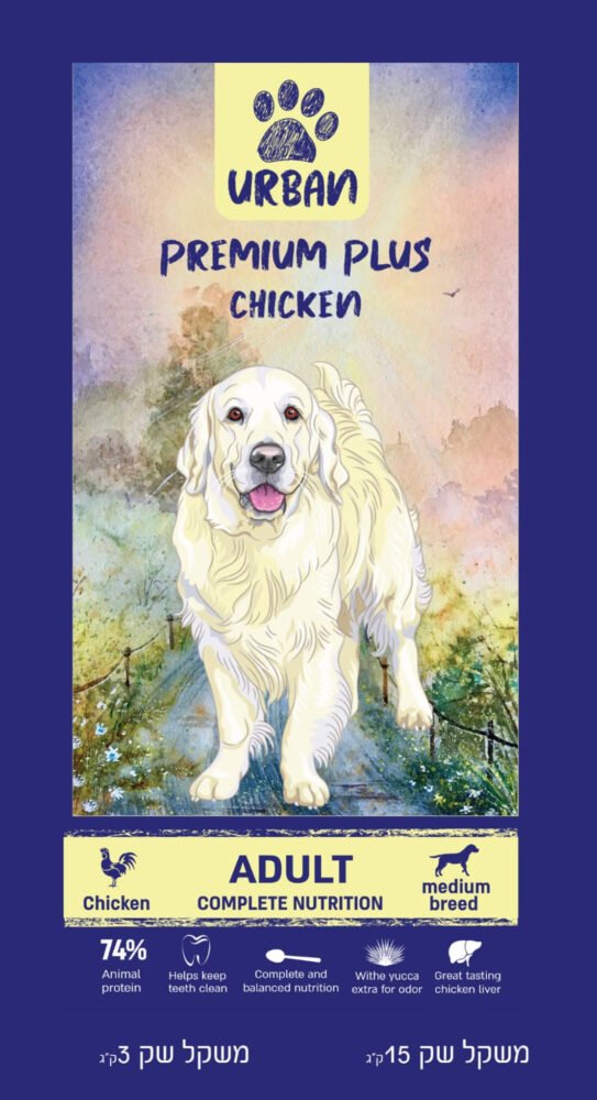 Urban Premium Plus עוף (15 ק"ג) – מזון פרימיום מלא לכלבים בוגרים, עשיר בעוף טרי ובחלבון איכותי לעיכול קל ובריאות מיטבית.