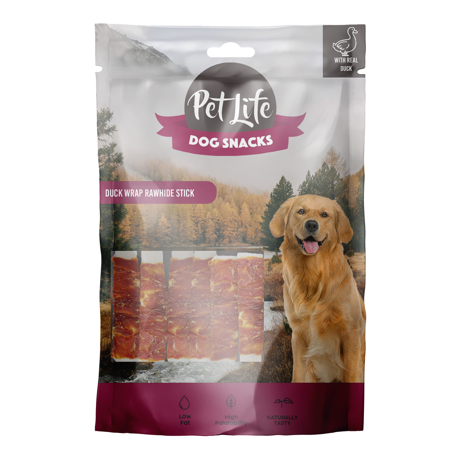 חטיף פט לייף ברווז מלופף על מקל עור גולמי משלב בשר ברווז איכותי המלופף סביב מקל עשוי עור בקר טבעי.