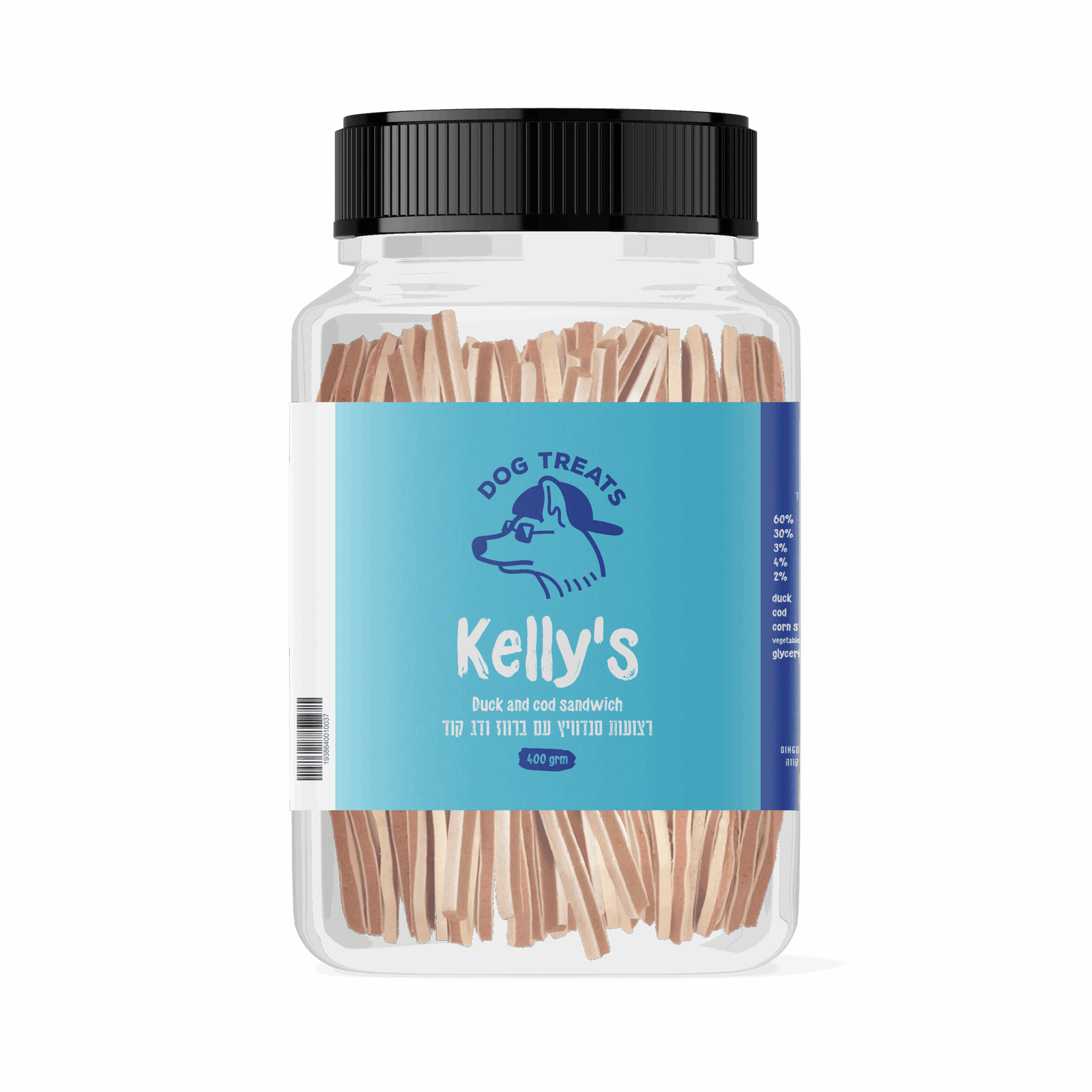 חטיף קליז רצועות סנדוויץ' ברווז ודג קוד (400 גרם) – פינוק טעים ובריא, עשיר בחלבון ואומגה 3 לשמירה על פרווה מבריקה ובריאות כללית.