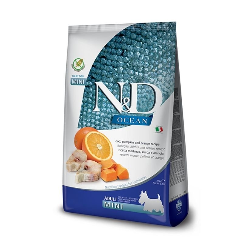 Farmina N&D אושן הרינג, דלעת ותפוז הוא מזון יבש סופר־פרימיום לכלבים בוגרים מגזעים קטנים, עם דג הרינג טרי כמקור חלבון עיקרי.